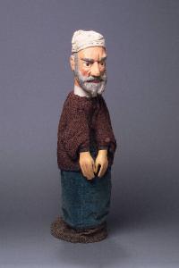 Calottina di tela bianca rinforzata internamente con tela grezza, inchiodata alla testa, in pessimo stato di conservazione (è tutta bucherellata e presenta anche due strappi alla sommità). Testa di legno con barba e baffi scolpiti, fronte corrugata, guance solcate da pieghe. Dipintura ad olio: incarnato chiaro, capelli, sopracciglia, ciglia, barba e baffi grigio chiaro, labbra rosse. Occhi di vetro ricavati da spilloni. Leggere scrostature di colore sulle sopracciglia e sulla punta del naso. Buchi ai lati della testa e sulla nuca, dovuti allle inchiodature precedenti. Colletto bianco, rigido, inchiodato. Giacca di lana marrone scuro, foderata di tela grigia, bordata con fettuccia nera all'intorno e ai polsi, inchiodata al collo anteriormente e cucita in un punto, sul davanti. Vestito di velluto blu scuro, bordato all'apertura per le braccia e all'imboccatura con fettuccia nera, foderato di tela a righe orizzontali variopinte, fissato con sistema coulisse. (continua in OSS)