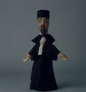 Cappello di tela nera, rinforzato internamente con cartoncino, inchiodato alla testa in tre punti. Testa di legno con barba (lunghe basette, "favoriti", separate anche sul mento) scolpita. Dipintura ad olio: capelli, sopracciglia, ciglia e barba grigio chiaro, incarnato chiaro, labbra rosse. Occhi di vetro ricavati da spilloni. Leggere scrostature di colore sul naso, sulla nuca, sul lato sinistro della barba e sul sopracciglio sinistro. Colletto bianco, rigido, inchiodato. Mantellina in panno di lana nero, inchiodata al collo in tre punti. Jabot in tela bianca fissato al vestito con uno spillo. Vestito di velluto nero, foderato con tela grigia, bordato con fettuccia marrone all'imboccatura, fissato al collo con chiodi e sistema coulisse. Buratto in tela a righe orizzontali bianche e blu (grandi e piccole), inchiodato al collo. Mani di legno inchiodate al buratto e dipinte ad olio. La sinistra, internamente, presenta scalfitture (ridipinte) alla punta dell'anulare e del mignolo.