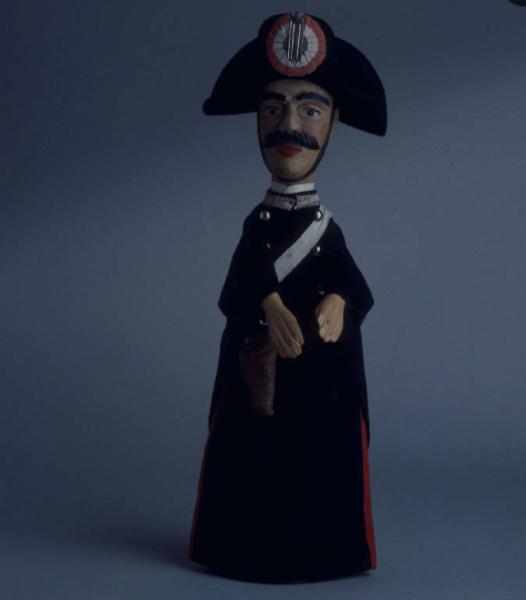 Cappello di feltro nero, rinforzato internamente con cartoncino, inchiodato in due punti ai lati della testa, decorato con coccarda tricolore (stinta) e fregio metallico. Sottogola in finta pelle nera, fissato con gli stessi chiodi che fermano il cappello. Testa di legno con baffi scolpiti. Dipintura ad olio: incarnato chiaro, guance rosa, capelli, sopracciglia, ciglia e baffi neri, labbra rosse. Occhi di vetro ricavati da spilloni. Colore in buono stato ma un po' sporco (macchie e ombreggiature più scure sulle parti chiare). Colletto bianco, rigido, inchiodato. Giacca di lana nera, terminante posteriormente a coda di rondine, foderata di tela nera, bordata al collo con passamaneria argento, inchiodata al collo in tre punti, cucita in due punti sul davanti, decorata con otto bottoni metallici semisferici color argento, cuciti sul davanti e due bottoni identici, all'altezza della martingala. (continua in OSS)