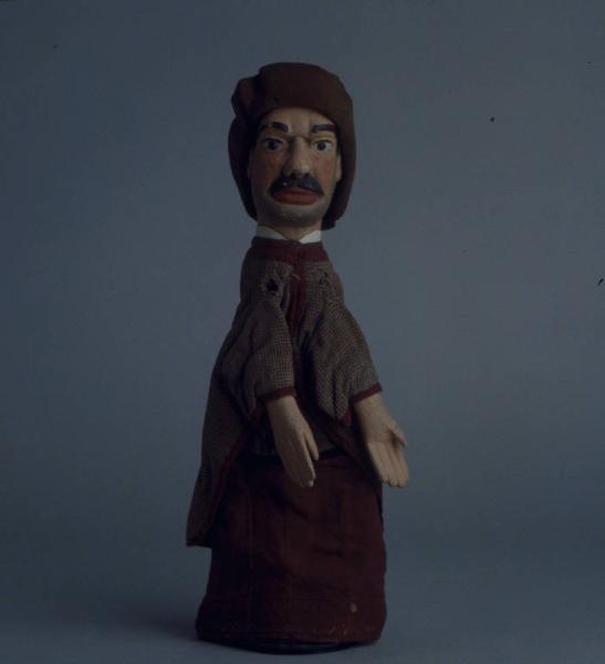 Cappello di feltro marrone, inchiodato alla testa in tre punti, un po' bucherellato sul davanti. Testa di legno con baffi scolpiti. Dipintura ad olio: incarnato roseo, ombreggiatura della barba, capelli, sopracciglia, ciglia e baffi marrone scuro, labbra rosse. Occhi di vetro ricavati da spilloni. Varie scrostature di colore, soprattutto sul naso. Orecchio destro scheggiato. Colletto bianco, rigido, inchiodato. Giacca in tessuto marrone e bianco puntinato, interamente bordata con fettuccia rossa, foderata di tela verde, inchiodata al collo in più punti, con vistosi strappi all'attaccatura delle maniche. Gilet di velluto verde, cucito al vestito, bordato con fettuccia nera, foderato di tela blu e bianca quadrettata e decorato con due bottoni neri. Vestito di tela marrone, foderato con tela chiara (strappata), fissato con sistema coulisse e un po' consunto (presenta piccoli buchi) nella parte inferiore. (continua in OSS)