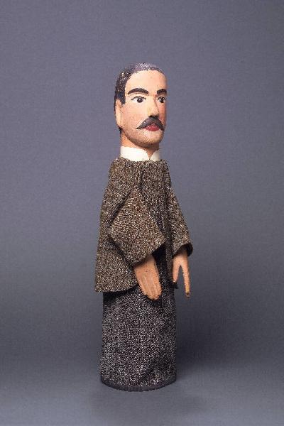 Testa di legno dipinta ad olio: incarnato chiaro, guance rosa, ombreggiatura della barba, capelli, sopracciglia, ciglia e baffi marrone scuro, labbra.rosse. Occhi di vetro ricavati da spilloni. Numerosi buchi alle tempie, sulla nuca e alla sommità della testa, provocati da precedenti inchiodature. Qualche scrostatura di colore sul viso; naso scheggiato sul lato destro. Colletto bianco, rigido, inchiodato. Giacca in panno di lana grigio puntinato, con sottili righe blu orizzontali, foderata di tela lilla, inchiodata al collo e cucita in un punto, sul davanti. La giacca presenta un piccolo foro alla manica destra. Vestito di lana grigia puntinata, con sottili righe rosse verticali, bordato con fettuccia nera all'imboccatura e all'attaccatura delle braccia, fissato con sistema coulisse. Buratto di tela grigia melange con sottili righe nere e blu verticali e beige orizzontali, inchiodato al collo e piuttosto sporco sul davanti. (continua in OSS)