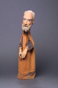 Capelli di pelo animale bianco inchiodati alla testa. Testa di legno con baffi e barba scolpiti. Dipintura a olio: incarnato chiaro, sopracciglia, ciglia, barba e baffi grigi, labbra rosse. Occhi di vetro ricavati da spilloni. Scrostature di colore sulla barba. Buratto di tela marrone chiaro con maniche di tela grigia a righine, inchiodato al collo. Mani di legno inchiodate al buratto, dipinte ad olio. Il burattino è privo di abito.