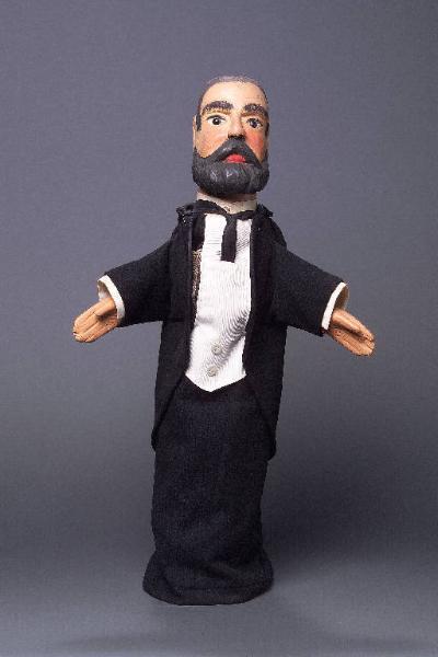 Testa di legno con barba e baffi scolpiti. Dipintura ad olio: incarnato chiaro, guance rosa, capelli, sopracciglia, ciglia, barba e baffi neri, labbra rosse. Occhi di vetro ricavati da spilloni. Colore un po' scrostato sulle guance; qualche buco sulla testa, parecchi in gola (inchiodature precedenti). Buratto di stoffa puntinata bianca e marrone, bordato all'imboccatura con fettuccia marrone, inchiodato al collo. Mani di legno inchiodate al buratto, dipinte ad olio, con scrostature di colore (poco evidenti) e macchioline nere sparse. Il burattino e privo di abito.