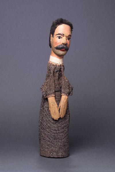 Capelli di pelo animale nero, inchiodati alla testa, leggermente consunti sul lato sinistro. Testa di legno con baffi scolpiti. Dipintura ad olio: incarnato chiaro, guance rosa, ombreggiatura della barba, sopracciglia, ciglia e baffi neri, labbra rosse. Occhi di vetro ricavati da spilloni. Scrostature di colore su sopracciglia, naso, orecchie e guance; fenditura verticale sul lato sinistro del volto. Colletto bianco, rigido, inchiodato. Buratto in tela a righe orizzontali (nero, grigio e marrone), inchiodato al collo. Mani di legno inchiodate al buratto, dipinte ad olio. Colore molto sporco, scrostature di colore. Tracce di colla sulla superficie interna della destra. Pollice sinistro scheggiato in punta. Il burattino è privo di abito.