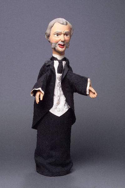Testa di legno con capelli e parte terminale dei baffi scolpiti, bocca aperta e sopracciglia corrugate. Dipintura ad olio: incarnato chiaro, guance rosa, ombreggiatura della barba (lieve), capelli, sopracciglia, ciglia e baffi grigi, labbra rosse. Occhi di vetro ricavati da spilloni. Colore leggermente scrostato sulla nuca; scheggiatura alla punta del baffo sinistro. Colletto bianco, rigido, inchiodato. Buratto di tela grigia, bordato internamente con fettuccia nera, e, al collo, con striscia di lana grigia, inchiodata al collo assieme al buratto. Mani di legno inchiodate al buratto, dipinte ad olio, leggermente macchiate di grigio. Il burattino è privo di abito.
