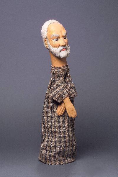 Capelli di pelo animale bianco, inchiodati alla testa. Testa di legno con barba e baffi scolpiti, fronte lievemente corrugata. Dipintura ad olio: incarnato chiaro, guance rosa, sopracciglia, ciglia, barba e baffi grigio chiaro, labbra rosse. Occhi di vetro ricavati da spilloni. Lievi scrostature sulla barba, sul naso e sul sopracciglio sinistro. Macchie più scure sulla fronte e sul naso. Profonda fenditura verticale sul lato destro, tra orecchio e barba. Buratto di tela verde a quadretti chiari e scuri, inchiodato al collo. Posteriormente apertura rettangolare chiusa con tela nera. Mani di legno inchiodate al buratto, dipinte ad olio. Il burattino è privo di abito.