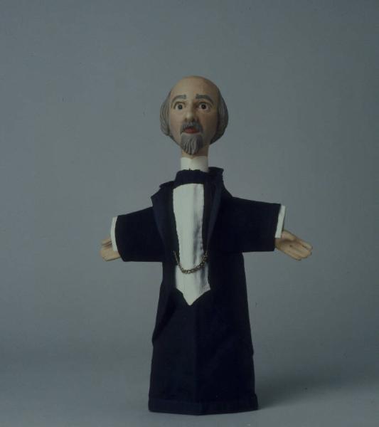 Testa di legno con capelli, baffi e pizzo finemente scolpiti. La sommità della testa è completamente pelata, mentre i capelli scendono, lunghi e ondulati, dai lati della testa fino a coprire le orecchie e la nuca. Dipintura ad olio: incarnato chiaro, capelli, ciglia, sopracciglia, pizzo e baffi grigi, ombreggiatura della barba, labbra rosse. Fenditura verticale lunga tre centimetri, sopra l'occhio destro. Occhi di vetro ricavati da spilloni. Colletto bianco rigido inchiodato. Giacca in tessuto di lana nero che termina posteriormente a coda di rondine, con collo e reverse in raso nero, con fodera in tela nera e polsini in tela bianca che sporgono dalle maniche, alle quali sono cuciti. Vestito in tela nera, fissato con sistema coulisse, bordato all'imboccatura, sia internamente che esternamente, con fettuccia nera e foderato in tela grigia. (continua in OSS)