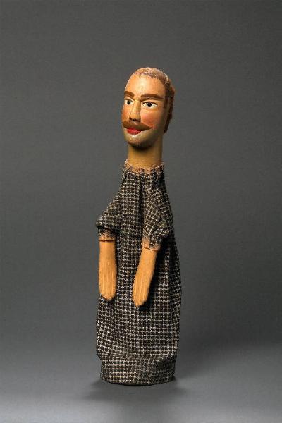 Capelli in pelo animale fulvo, inchiodati soltanto sulla nuca: la parte superiore della testa è dipinta. Testa di legno con baffi scolpiti. Dipintura ad olio: incarnato chiaro, guance rosa, ombreggiatura della barba, capelli (dove manca la parrucca), sopracciglia, ciglia e baffi marroni, labbra rosse. Occhi di vetro ricavati da spilloni. Le parti prive di parrucca presentano innumerevoli buchi (inchiodature precedenti). Buratto di lana a quadretti beige e neri, inchiodato al collo. Mani di legno inchiodate al buratto, dipinte ad olio, con scrostature e scalfitture. Il burattino e privo di abito.
