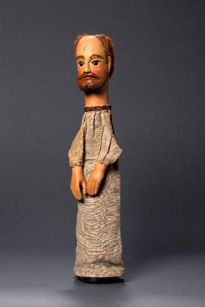 Capelli di pelo animale fulvo, inchiodati alla testa, mancanti in una zona ristretta, alla sommità della testa. Testa di legno con barba e baffi scolpiti. Dipintura ad olio: incarnato chiaro, guance rosa, capelli (dove manca la parrucca), basette, sopracciglia, ciglia, barba e baffi marroni, labbra rosse. Occhi di vetro ricavati da spilloni. Numerosi buchi sulla parte priva di parrucca (inchiodature precedenti). Scrostature di colore su guancia e sopracciglio sinistri, naso, baffi e orecchio sinistro. Macchia di grigio al centro della fronte. Buratto di tela grezza grigio chiaro, bordato internamente con fettuccia azzurra e, al collo, con striscia di cuoio marrone, inchiodata assieme al buratto. La tela è piuttosto sporca e presenta un grossolano rammendo sul lato sinistro. Mani di legno inchiodate al buratto, dipinte ad olio con scrostature sparse. Il burattino è privo di abito.