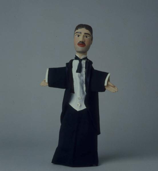 Testa di legno con capelli scolpiti. Dipintura ad olio: incarnato chiaro, guance rosa, ombreggiatura della barba, capelli, sopracciglia, ciglia e baffi marroni, labbra rosse. Occhi di vetro ricavati da spilloni (il sinistro è scheggiato). Il colore marrone dei capelli è lucido, ma presenta due abrasioni opache ai lati della testa, sopra le orecchie (la sinistra è più estesa). Colletto bianco, rigido, inchiodato. Frac in panno di lana nero, con collo di raso nero, foderato di cotone nero, fissato con uno spillo, sul davanti; all'interno delle maniche sono cuciti i polsini bianchi della camicia. Panciotto di piqué bianco cucito al vestito, decorato con due bottoni bianchi, rotondi; sul panciotto è cucita la cravatta nera, di finto raso. Vestito di lana nero, foderato di cotone nero, fissato con sistema coulisse, bordato all'apertura per le maniche con fettuccia nera. Buratto di tela grigioverde bordato internamente con fettuccia nera e inchiodato al collo. (continua in OSS)