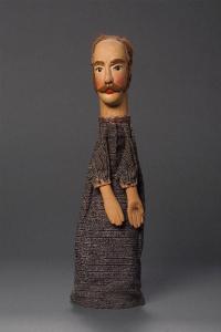 Capelli di pelo animale fulvo, un po' consunti alla sommità della testa, inchiodati. Testa di legno con baffi e lunghe basette ("favoriti") scolpiti. Dipintura ad olio: incarnato chiaro, guance rosa, basette, sopracciglia, ciglia e baffi marroni, labbra rosse. Occhi di vetro ricavati da spilloni. Lievi scrostature di colore su naso e guancia destra. Buratto di tela bianca e nera melange con righe nere orizzontali, bordato al collo con striscia di cuoio marrone, inchiodata assieme al buratto. Mani di legno inchiodate al buratto e dipinte ad olio. Il burattino è privo di abito.