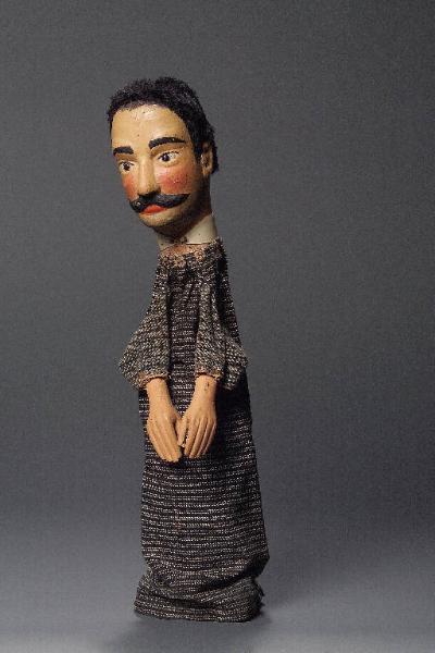 Capelli in finto pelo nero, inchiodati alla testa. Testa di legno con baffi scolpiti. Dipintura ad olio: incarnato chiaro, guance rosa sopracciglia, ciglia e baffi neri, labbra rosse, ombreggiatura della barba. Occhi di vetro ricavati da spilloni. Lievi scrostature di colore su mento, baffo destro e guancia sinistra. Colletto bianco, rigido, inchiodato. Buratto di tela bianca e nera melange con righe nere orizzontali, inchiodato al collo. Mani di legno inchiodate al buratto, dipinte ad olio, con qualche macchiolina nera sulla sinistra. Il burattino è privo di abito.