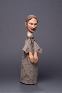 Testa di legno con capelli, basette e baffi scolpiti finemente. Sopracciglia corrugate e guance scavate. Dipintura ad olio: incarnato chiaro, guance rosa, ombreggiatura della barba, capelli, basette, sopracciglia, ciglia e baffi marroni, labbra rosse. Occhi di vetro ricavati da spilloni. Piccola screpolatura a forma di "T" tra il naso e l'occhio sinistro. Colletto bianco, rigido, inchiodato. Buratto in tela grezza color grigio, bordato internamente con fettuccia nera, e, al collo, con striscia di stoffa grigioverde, inchiodata al collo assieme al buratto. Mani di legno inchiodate al buratto, dipinte ad olio, con qualche macchia di grigio. Il burattino è privo di abito.