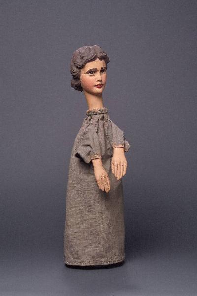 Testa di legno con capelli finemente scolpiti. Dipintura ad olio: incarnato chiaro, guance rosa, capelli, sopracciglia e ciglia marroni, labbra rosse. Occhi di vetro ricavati da spilloni. Dalla sommità della testa si dipartono numerose sottili fenditure (la più evidente è sul lato destro e misura circa cm. 7 di lunghezza). Buratto grigio di tela grezza, bordato internamente con fettuccia nera e, al collo, con striscia di stoffa grigioverde inchiodata al collo assieme al buratto stesso. Mani di legno inchiodate al buratto, dipinte ad olio, con macchioline scure su tutta la superficie. Il burattino è privo di abito.
