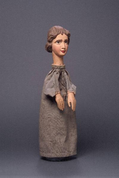 Testa di legno con capelli finemente scolpiti. Dipintura ad olio: incarnato chiaro, guance rosa, capelli, sopracciglia e ciglia marroni, labbra rosse. Occhi di vetro ricavati da spilloni. Piccole fenditure verticali sui capelli. Buratto di tela grezza, grigio, un po' sporco sul davanti, bordato internamente con fettuccia nera e, al collo, con striscia di stoffa grigioverde inchiodata al collo assieme al buratto. Mani di legno inchiodate al buratto, dipinte ad olio e macchiate di scuro qua e là. Il burattino è privo di abito.