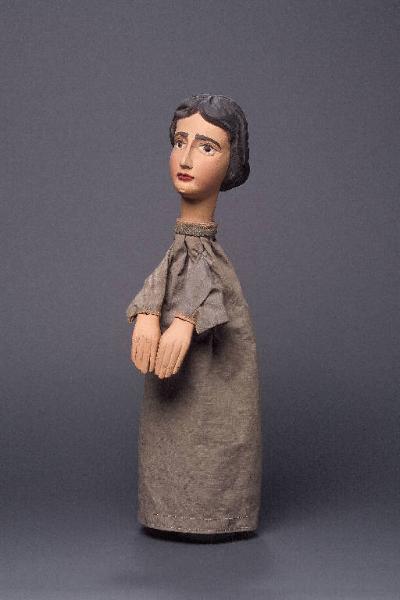 Testa di legno con lunghi capelli scolpiti. Dipintura ad olio: incarnato chiaro, capelli, sopracciglia e ciglia neri, labbra rosse. Occhi di vetro ricavati da spilloni. Profonda fenditura sul lato destro del viso, che attraversa verticalmente capelli, tempia e guancia, lunga circa cm. 12. Altra fenditura molto meno evidente, verticale, sul lato sinistro (dai capelli all' occhio). Buratto grigio, di tela grezza, bordato internamente con fettuccia nera e, al collo, con striscia di stoffa grigioverde inchiodata al collo assieme al buratto. Mani di legno inchiodate al buratto, dipinte ad olio, un po' sporche di nero (specialmente la destra). Il burattino è privo di abito.