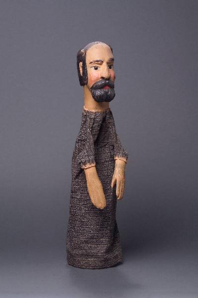 Capelli di pelo animale nero, inchiodati alla testa; sulla parte superiore della testa la parrucca non c'è e il legno è stato dipinto in nero. Testa di legno con basette, barba e baffi scolpiti. Dipintura ad olio: incarnato chiaro, guance rosa, basette, sopracciglia, ciglia, barba e baffi neri, labbra rosse. Occhi di vetro ricavati da spilloni. Numerose scrostature di colore (orecchie, basette, sopracciglia, naso, baffi, guance). La sommità della testa, priva di parrucca, presenta alcuni buchi (inchiodature precedenti) e il nero con cui è stata dipinta è sbiadito, opaco e macchiato di rosa. Buratto di tela bianca e nera melange con righe nere orizzontali, inchiodato al collo, piuttosto sporco. Mani di legno inchiodate al buratto, dipinte ad olio, sporche e con parecchie scrostature di colore. Dita consumate in punta, pollici scheggiati. Il burattino è privo di abito.