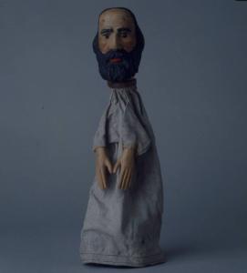 Testa di legno con capelli, folta barba e baffi scolpiti. Dipintura ad olio: incarnato chiaro, guance rosa, capelli, sopracciglia, ciglia, barba e baffi neri, labbra rosse. Occhi di vetro ricavati da spilloni. Scrostature di colore sulla fronte, sulle sopracciglia, sul naso e sulla barba. Buchi alle tempie e nella zona dei capelli (inchiodature precedenti). Buratto grigio, di tela grezza piuttosto sporca, bordato internamente con fettuccia nera e, al collo, con striscia di cuoio inchiodata al collo assieme al buratto. Mani di legno inchiodate al buratto, dipinte ad olio, con lievi scrostature e macchioline nere su tutta la superficie. Il burattino è privo di abito.