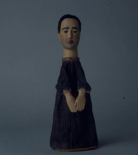 Capelli di finto pelo nero, inchiodati alla testa. Testa di legno dipinta ad olio: incarnato chiaro, guance rosa, ombreggiatura della barba, ciglia e sopracciglia nere, labbra rosse. Occhi di vetro ricavati da spilloni. Lievi scrostature di colore al naso e all'angolo destro della bocca. Buratto di tela melange scuro con righe nere verticali, bordato, all'imboccatura, con fettuccia verde chiaro e, al collo, con striscia di cuoio inchiodata al collo, assieme al buratto. Mani di legno inchiodate al buratto, dipinte ad olio, con scrostature di colore (non molto evidenti) e macchioline nere. Il burattino è privo di abito.