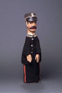 Berretto di feltro nero, rinforzato internamente con cartoncino, inchiodato alla testa in tre punti, con visiera in finta pelle nera, bordato inferiormente con fettuccia rossa e decorato con fregio metallico, tre striscie di fettuccia rossa, passamaneria color beige e due borchie metalliche ai lati della visiera, che trattengono una fascetta di finta pelle nera. Testa di legno con baffi scolpiti. Dipintura ad olio: incarnato chiaro, guance rosa, ombreggiatura della barba, capelli, sopracciglia, ciglia e baffi neri, labbra rosse. Occhi di vetro ricavati da spilloni (il destro è scheggiato). Naso consumato (la punta è stata inchiodata e incollata) e scrostato; scrostature di colore anche su guance e sopracciglia. Colletto bianco, rigido, inchiodato. (continua in OSS)