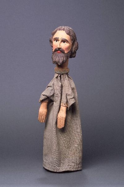 Testa di legno con capelli, barba e baffi finemente scolpiti; due piccole pieghe tra le sopracciglia. Dipintura ad olio: incarnato chiaro, guance rosa, capelli, sopracciglia, ciglia, barba e baffi marroni, labbra rosse. Occhi di vetro ricavati da spilloni. Una lunga e profonda fenditura (dalla sommita del capo all'attaccatura della barba) deturpa il lato destro del volto. Il colore è un po' sporco su naso e fronte. Buratto grigio di tela grezza, bordato internamente con fettuccia nera e, al collo, con striscia di stoffa grigioverde inchiodata assieme al buratto. Mani di legno inchiodate al buratto, dipinte ad olio, con macchie marroni sparse su tutta la superficie. Il burattino è privo di abito.