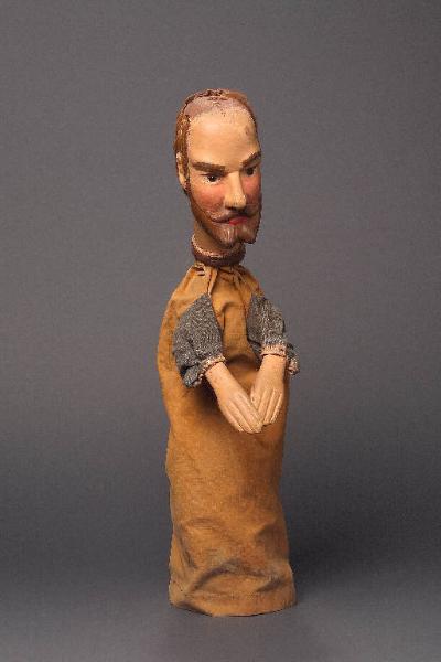 Capelli di pelo animale fulvo, inchiodati alla testa, un po' consunti qua e là e mancanti del tutto sulla parte superiore della testa. Testa di legno con barba e baffi scolpiti. Dipintura ad olio: incarnato chiaro, guance rosa, sopracciglia, ciglia, barba e baffi marroni, labbra rosse. Occhi di vetro ricavati da spilloni. Scrostature di colore su sopracciglia, naso, baffi e lato sinistro della fronte. Alla sommità della testa, dove manca la parrucca, vi sono numerosi buchi da inchiodature e un foro molto più grande e profondo. Buratto di tela beige con maniche grigie, bordato, al collo, con striscia di cuoio inchiodata assieme al buratto. Mani di legno inchiodate al buratto, dipinte ad olio con lievi macchioline e scrostature. Il burattino è privo di abito.