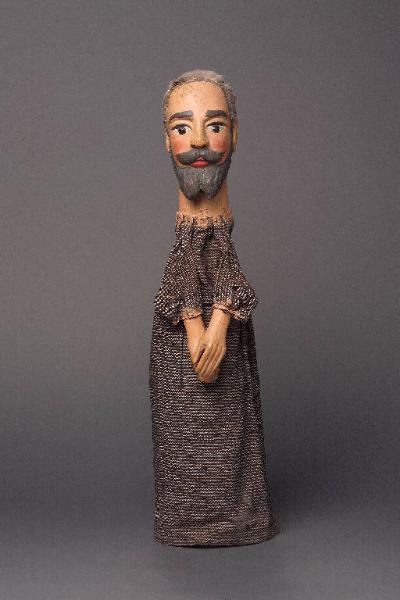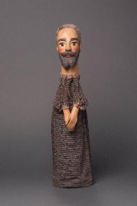 Capelli di pelo animale grigio, inchiodati alla testa, un po' consunti sulla nuca e alla tempia destra. Testa di legno con barba e baffi scolpiti. Dipintura ad olio: incarnato chiaro, guance rosa, sopracciglia, ciglia, barba e baffi grigi, labbra rosse. Occhi di vetro sfaccettato, ricavati da spilloni. Colore scrostato sulle sopracciglia e lievi scrostature anche su naso, baffi e barba. Qualche macchia scura sulla fronte. Buratto di tela a righine orizzontali bianche, nere e marroni, inchiodato al collo. Mani di legno inchiodate al buratto, con lievi tracce di sporcizia. Il burattino è privo di abito.