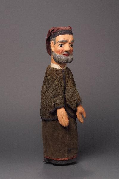 Berretto di velluto amaranto inchiodato alla testa in molti punti, un po' consunto alla sommità della testa. Testa di legno con barba scolpita e leggere pieghe sulle guance e intorno alle sopracciglia. Dipintura ad olio: incarnato chiaro, guance rosa, capelli, sopracciglia, ciglia, barba e baffi grigi, labbra rosse. Occhi di vetro ricavati da spilloni. Scrostature di colore su sopracciglia, naso, guance e barba. Colletto, bianco, rigido, inchiodato. Giacca di lana verde scuro puntinato in nero, inchiodata al collo anteriormente, foderata di tela a righe verticali bianche e rosse, bordata all'intorno e ai polsi con fettuccia nera.