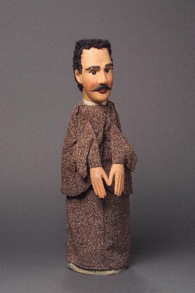 Capelli di tessuto nero bouclé a imitazione di capigliatura riccia, inchiodati alla testa, un po' consunti sulla nuca. Testa di legno con baffi scolpiti. Dipintura ad olio: incarnato chiaro, guance rosa, sopracciglia, ciglia e baffi neri, labbra rosse. Occhi di vetro ricavati da spilloni. Scrostature di colore su sopracciglia, naso, guance\ne mento. Qualche macchiolina nera sulle guance e sulla fronte. Colletto bianco, rigido, inchiodato. Giacca di grisaglia di lana color nocciola (melange), foderata di tela chiara, fissata con sistema coulisse e cucita in un punto, sul davanti. Sotto la giacca, cucito al vestito, vi è il panciotto, marrone, foderato di tela lilla e decorato con tre bottoni di materia plastica marrone chiaro, rotondi. Vestito identico alla giacca per materiale e colore, bordato con fettuccia nera all'apertura per le braccia e fissato con sistema coulisse. (continua in OSS)