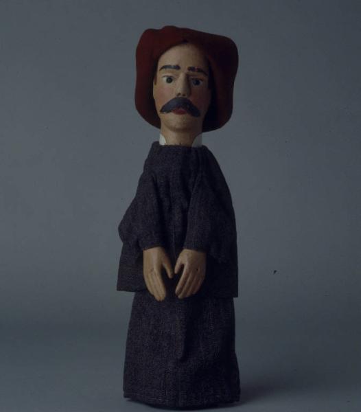 Cappello di feltro marrone, inchiodato alla testa in tre punti, con parecchi buchi (inchiodature precedenti). Testa di legno con baffi leggermente scolpiti. Dipintura ad olio: incarnato chiaro, guance rosa, capelli marrone chiaro e sopracciglia, ciglia e baffi più scuri, labbra rosse. Occhi di vetro ricavati da spilloni. Scrostature di colore su sopracciglia, naso (consumato), guancia e orecchio destri, baffi e mento. Colletto bianco, rigido, inchiodato. Giacca di lana grigio scuro melange, con righine orizzontali blu e beige, foderata di tela lilla, inchiodata al collo anteriormente e cucita in un punto, sul davanti. (continua in OSS)