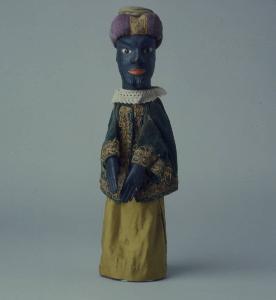 Turbante imbottito, inchiodato alla testa in vari punti, bicolore: la parte superiore è di tela verde oliva; quella inferiore in velluto lilla, decorato con quattro bande verticali di passamaneria dorata, ai quattro lati della testa. Testa di legno con pizzo scolpito. Dipintura ad olio: incarnato e barba neri, labbra rosse. Occhi di vetro ricavati da spilloni. Leggere scrostature (sopracciglia, naso) e una. scalfittura alla barba. Gorgiera di pizzo bianca, assai sporca, inchiodata al collo posteriormente. Giacca di velluto verde, fissata con sistema coulisse, foderata di tela chiara e marroncina, decorata all'intorno e ai polsi con passamaneria dorata. Vestito in rasatello di cotone giallo senape, foderato di tela rosa, fissato con sistema coulisse e un chiodo. Giacca e vestito presentano qualche macchia di altro colore. (continua in OSS)