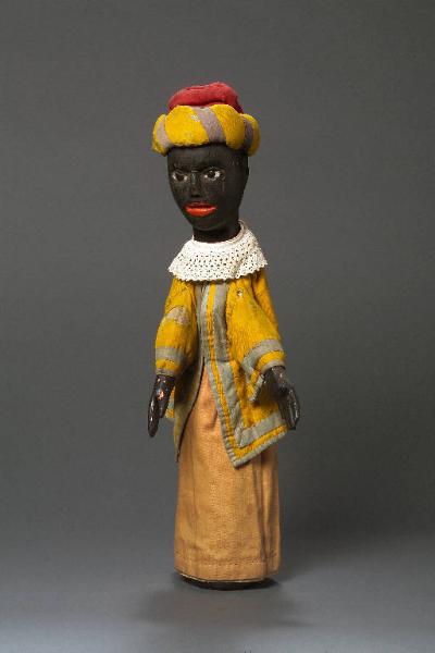 Turbante imbottito, inchiodato alla testa in vari punti: la parte superiore è di cotone rosso; inferiormente, fascia di cotone giallo, decorata con bande oblique di fettuccia viola. La tela è consunta e bucata in vari punti. Testa di legno dipinta ad olio: incarnato nero, labbra rosse. Occhi di vetro ricavati da spilloni. Naso molto consumato in punta, scheggiato e ridipinto; scrostaure e scalfitture sparse, scheggiature leggere sulle orecchie. Giacca di tela gialla, fissata con sistema coulisse e un chiodo, foderata di tela bianca, bordata all'intorno e ai polsi con doppia striscia di fettuccia azzurra, decorativa. Il tessuto è macchiato sulla schiena e sul lato sinistro, e presenta un vistoso squarcio sulla manica destra, nonché altri buchi sparsi sulla schiena e sul lato destro. Vestito di rasatello rosso (stinto), fissato con sistema coulisse e due chiodi, bordato con fettuccia rossa all'apertura per le braccia. (continua in OSS)