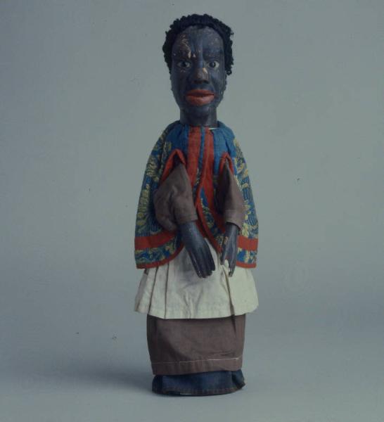 Capelli di finto pelo nero a imitazione di capigliatura riccia, inchiodati alla testa, consunti sulla parte superiore. Testa di legno con fronte corrugata. Bocca originariamente mobile, poi fissata (inchiodata ai lati del mento), foro in gola chiuso con inserto inchiodato di finta pelle (dipinto in marrone scuro, come l'incarnato). Bocca socchiusa (visibili, all'interno, i denti scolpiti nell'arcata superiore). Dipintura ad olio: incarnato nero (marrone scurissimo), labbra rosse. Occhi di vetro ricavati da spilloni. Sul lato destro della fronte, sopra l'occhio, a causa di una notevole scheggiatura (lunga cm. 3 e alta cm. 2,5 ca.) è stato inchiodato un pezzo di legno rozzamente tagliato, la cui curvatura eccede dalla curva della fronte e il cui perimetro non combacia esattamente con i contorni della scheggiatura. Scrostature di colore sparse, che lasciano intravvedere una precedente colorazione in rosa. (continua in OSS)
