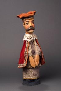 Berretto di velluto rosso inchiodato alla testa; inferiormente il velluto è rinforzato internamente con cartoncino e decorato con passamaneria argento. Testa di legno con baffi scolpiti. Dipintura ad olio: incarnato chiaro, guance rosa, ombreggiatura della barba, capelli, sopracciglia, ciglia e baffi marroni, labbra rosse. Occhi di vetro ricavati da spilloni. Scrostature di colore su sopracciglia, naso, guance, baffi e nuca. Gorgiera di pizzo bianca, inchiodata al collo posteriormente. Mantello di cotone rosso, fissato con sistema coulisse, bordato con fettuccia chiara al collo, e arancione all'intorno, foderato di tela rossa e decorato all'intorno con passamaneria argentata. (continua in OSS)