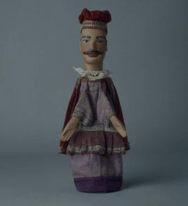 Berretto di velluto rosso, inchiodato alla testa. Inferiormente il tessuto è rinforzato internamente con cartoncino e decorato con passamaneria argentata. Testa di legno con baffi scolpiti. Dipintura ad olio: incarnato chiaro, guance rosa, capelli, sopracciglia, ciglia e baffi marroni, labbra rosse. Occhi di vetro ricavati da spilloni. Scrostature di colore sparse su tutto il viso. Gorgiera di pizzo bianca, inchiodata al collo posteriormente. Mantello di cotone rosso, fissato con sistema coulisse, bordato con fettuccia chiara al collo e arancione all'intorno, foderato di tela rossa e decorato all'intorno con passamaneria argentata. Vestito in damasco di cotone, con disegni argentati su fondo viola, fissato con sistema coulisse, foderato di tela marrone, bordato inferiormente con striscia di rasatello viola e, ai polsi, con passamaneria argentata. Il tessuto è un po' stinto e i disegni argentati sono assai consunti e sfilacciati. (continua in OSS)