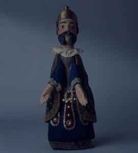 Elmo in ottone composto da più parti saldate insieme; alla sommità fuoriesce, da un foro, della fibra rossa che probabilmente era un pennacchio. L'elmo è inchiodato alla testa in tre punti. Testa di legno dipinta ad olio: incarnato chiaro, guance rosa, capelli, sopracciglia, ciglia barba e baffi neri, labbra rosse. Barba e baffi sono scolpiti nel legno. Occhi di vetro ricavati da spilloni. Colore scalfito in più punti. Gorgiera di pizzo bianca, inchiodata al collo posteriormente. Mantello di velluto verde foderato di tela azzurrina e rosa antico (al centro). Il mantello è fissato con sistema coulisse e decorato all'intorno con passamaneria dorata, lustrini metallici e passamaneria oro piu sottile. Vestito in tessuto blu e fodera di tela bianca, bordato in nero al collo e all'orlo. Le maniche sono rovinate nel punto di giunzione al vestito; sono bordate ai polsi con passamaneria bianca e argento. Sul petto c'è una fascia longitudinale in tessuto laminato argento. (continua in OSS)