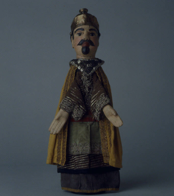 Elmo in ottone composto da più parti saldate insieme, inchiodato alla testa in due punti (un terzo chiodo, che fissava l'elmo alla nuca, manca). Testa di legno con pizzo e baffi scolpiti. Dipintura ad olio: incarnato chiaro, guance rosa, capelli, sopracciglia, ciglia, barba e baffi marrone scuro, labbra rosse. Occhi di vetro ricavati da spilloni. Collare in tessuto laminato (nero e argento) decorato con passamaneria argento e lustrini metallici (molti mancanti), inchiodato al collo, posteriormente. Mantello di tela gialla, con fodera marrone, fissato con sistema coulisse e decorato con doppia striscia di passamaneria oro. Vestito in tessuto laminato (argento e marrone a righe) con decorazioni in passamaneria argento sul petto e ai polsi (rovinata). Il vestito è bordato al collo e all'orlo con traversino nero, è fissato con sistema coulisse e la fodera è di tela grezza chiara. (continua in OSS)