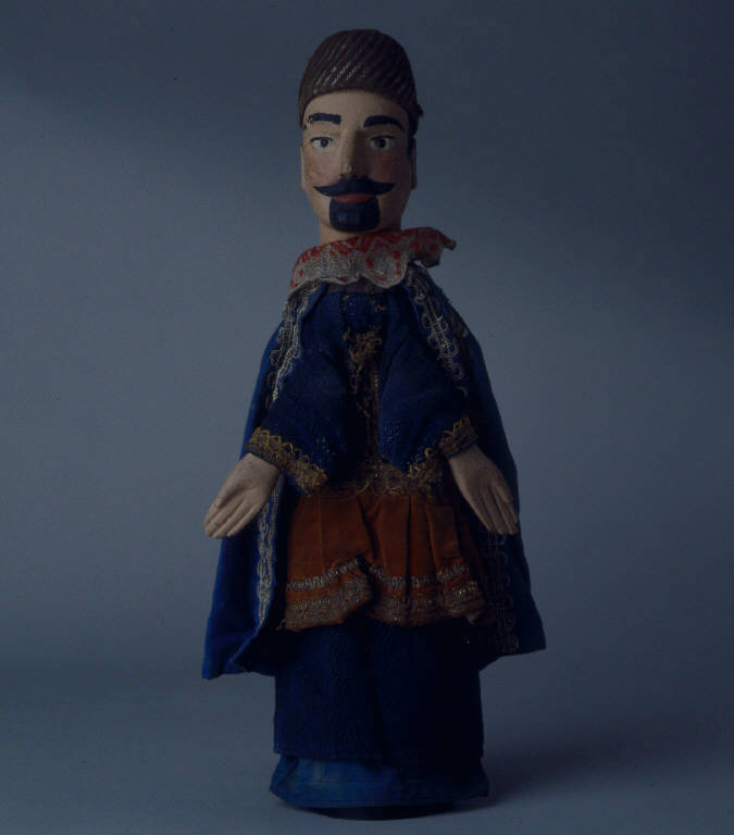 Berretto rigido, di cartone rivestito con tessuto laminato in argento a righe trasversali marroni in rilievo. Alla sommità borchia metallica. Il berretto è fissato alla testa con due chiodi. Testa di legno con baffi leggermente scolpiti. Dipintura ad olio: incarnato chiaro, ombreggiatura della barba, capelli, sopracciglia, barba e baffi marrone scuro, labbra rosse. Occhi di vetro ricavati da spilloni. Sono visibili ritocchi di colore. Collare di tela con ricami in lana rossa, bordato con traversino rosso e inchiodato al collo. Mantello di velluto rosso foderato con tela bordeaux e nera, bordato con passamaneria oro disposta in due file, una delle quali (la più interna) è più sottile. Il mantello è fissato con sistema coulisse. Vestito in tessuto blu laminato in argento, con fodera in tela bianca. (continua in OSS)