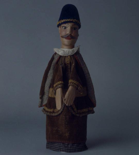 Berretto rigido, di cartone rivestito con velluto blu, bordato alla base con passamaneria oro e fissato alla testa con un chiodo. Testa di legno dipinta ad olio: incarnato chiaro, capelli, sopracciglia, ciglia, baffi (scolpiti) marroni, labbra rosse. Sui capelli dipinti sono inchiodati capelli di pelo marrone. Occhi di vetro ricavati da spilloni. Il colore è scrostato in più punti e sono visibili ritocchi. Gorgiera di pizzo bianco, inchiodata al collo del burattino. Mantello di velluto verde scuro, con fodera marrone, bordato con fettuccia di lana marrone, decorato all'intorno con passamaneria argentata più larga e più sottile e fissato con sistema coulisse. Vestito di velluto verde con fodera di tela stampata a triangoli gialli e blu, bordato con traversino marrone. Sul vestito sono applicate le balze della giacca, i cui bordi sono decorati con passamaneria dorata. (continua in OSS)