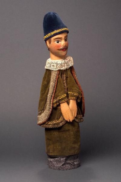 Berretto rigido, di cartoncino rivestito con velluto blu, bordato alla base con passamaneria dorata, fissato alla testa con tre chiodi. Testa di legno dipinta ad olio: incarnato chiaro, ombreggiatura della barba, capelli, sopracciglia, ciglia e baffi (scolpiti) marroni, labbra rosse. Sui capelli dipinti sono stati inchiodati capelli in pelo marrone. Occhi di vetro ricavati da spilloni. Gorgiera di pizzo bianca, inchiodata al collo. Mantello di velluto verde, con fodera marrone con bordatura di traversino di lana marrone. All'intorno, decorazione in passamaneria argentata sottile e più spessa. Il mantello è fissato con sistema coulisse. Vestito di velluto verde, con fodera grigia, bordato all'orlo con traversino verde; al vestito sono applicate le balze della giacca, bordate con passamaneria oro in due striscie; sul davanti striscia longitudinale di passamaneria, cintura in vita e decorazioni ai polsi. (continua in OSS)