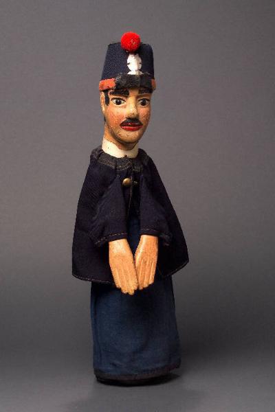 Berretto con visiera, di cartone rivestito con tessuto di lana blu, calotta nera, bordo in traversino rosso (presenta vari buchi), visiera in finta pelle nera cucita al bordo del berretto, fregio metallico cucito, pompon di lana rossa alla sommità; il berretto è fissato alla testa con due chiodi. Testa di legno dipinta ad olio: incarnato chiaro, ombreggiatura della barba, capelli, sopracciglia, ciglia, baffi neri, labbra rosse. Occhi di vetro ricavati da spilloni. Il colore è scrostato in più punti. Colletto bianco, rigido, inchiodato. Giacca in tessuto di lana blu con fodera nera, bordo superiore con traversino scuro, sei bottoni metallici, fissata con sistema coulisse e un chiodo. (continua in OSS)