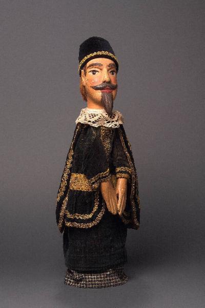 Cappello rigido, di cartone rivestito di velluto nero, bordato alla base con passamaneria dorata e fissato alla testa con due chiodi. Testa di legno dipinta ad olio: incarnato chiaro, sopracciglia, ciglia, barba e baffi (scolpiti) marroni, capelli marroni sui quali ne sono stati inchiodati altri, di uguale colore, ma di pelo; labbra rosse. Occhi di vetro ricavati da spilloni. Gorgiera di pizzo bianco, inchiodata al collo. Mantello di velluto nero con fodera rosa antico, bordato con due file di passamaneria dorata (all'intorno) e fissato con sistema coulisse. Vestito di velluto verde, con fodera rossa, bordato anteriormente e ai polsi con passamaneria dorata di diversa larghezza. In vita passamaneria dorata a mo' di cintura. (continua in OSS)
