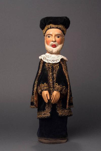 Berretto di velluto nero, inchiodato alla testa; inferiormente il velluto è rinforzato con cartoncino e decorato con passamaneria dorata. Capelli di pelo animale bianco, inchiodati alla testa. Testa di legno con barba e baffi scolpiti. Dipintura ad olio: incarnato chiaro, guance rosa, basette, sopracciglia, ciglia, barba e baffi grigi, labbra rosse. Occhi di vetro ricavati da spilloni. Qualche macchiolina scura sulle sopracciglia e la barba. Gorgiera di pizzo bianca, inchiodata posteriormente. Mantello di velluto nero, fissato con sistema coulisse, decorato all'intorno con doppia striscia di passamaneria dorata, con fodera arancione in misto rayon-cotone. Giacca di velluto nero, fissata con sistema coulisse, foderata di tela grigia, decorata all'intorno e ai polsi con passamaneria dorata. In vita è cucita una cintura di velluto nero, ricoperta da passamaneria dorata. (continua in OSS)