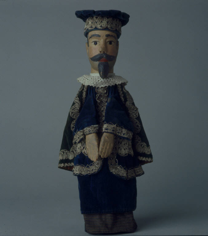 Berretto di velluto blu oltremare stinto, inchiodato alla testa; inferiormente il velluto è rinforzato con cartoncino e decorato con passamaneria argentata. Testa di legno con barba e baffi scolpiti. Dipintura ad olio: incarnato chiaro, guance rosa, ombreggiatura della barba, capelli, sopracciglia, ciglia, barba e baffi grigi, labbra rosse. Occhi di vetro ricavati da spilloni. Scrostature di colore sparse su tutto il viso. La barba (pizzetto) è spezzata all'attaccatura ed e stata riattaccata (incollata e inchiodata). Gorgiera di pizzo bianca, fissata con uno spillo, posteriormente. Mantello di velluto verde, fissato con sisteme coulisse, con fodera di cotone marroncina, decorato all'intorno con doppia striscia di passamaneria argentata. (continua in OSS)