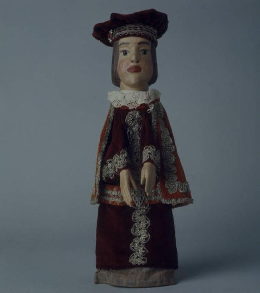 Berretto di velluto amaranto, inchiodato alla testa; inferiormente il tessuto è rinforzato con cartoncino e decorato con passamaneria argentata e una spilla con sette false pietre preziose, puntata sulla sinistra. Testa di legno con capelli scolpiti. Dipintura ad olio: incarnato chiaro, guance rosa, capelli, sopracciglia e ciglia marroni, labbra rosse. Occhi di vetro ricavati da spilloni. Scrostature di colore sparse su tutto il viso. Gorgiera di pizzo bianca, fissata con uno spillo. Mantello di velluto arancione, foderato di misto rayon-cotone arancione, decorato all'intorno con doppia striscia di passamaneria argentata, fissato con sistema coulisse. (continua in OSS)