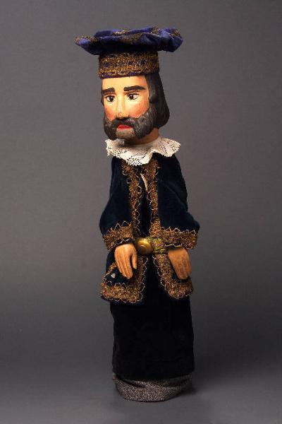 Berretto di velluto blu elettrico con striscie bianche e nere melange, inchiodato alla testa; inferiormente il tessuto è rinforzato con cartoncino e decorato con passamaneria dorata. Testa di legno con capelli, barba e baffi scolpiti. Dipintura ad olio: incarnato chiaro, guance rosa, capelli, sopracciglia, ciglia, barba e baffi neri, labbra rosse, parte centrale del mento (senza barba) grigia. Occhi di vetro ricavati da spilloni. Scrostature di colore sulle parti nere e sul naso, che è pure consumato in punta e presenta scalfitture. Gorgiera di pizzo bianca, fissata posteriormente con uno spillo. Giacca di velluto blu scuro, fissata con sistema coulisse, foderata di tela marrone, decorata all'intorno e ai polsi con passamaneria dorata e inferiormente, sul davanti, da otto false pietre preziose (due smeraldi e sei brillanti), quattro per parte. (continua in OSS)