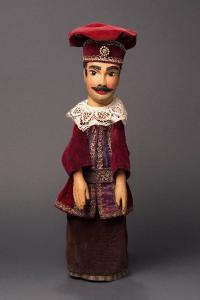 Berretto di velluto rosso, inchiodato alla testa; inferiormente il velluto è rinforzato con cartoncino, decorato con doppia fila di passamaneria argentata e un diadema tempestato di falsi brillanti, cucito anteriormente. Capelli di pelo animale nero, inchiodati alla testa, un po' consunti sulla nuca. Testa di legno con baffi leggermente in rilievo. Dipintura ad olio: incarnato chiaro, guance rosa, ombreggiatura della barba, basette, sopracciglia, ciglia e baffi neri, labbra rosse. Occhi di vetro ricavati da spilloni. Scrostature di colore su sopracciglia, guance, naso e baffi (molto evidenti sulle parti in nero). Colletto bianco, rigido, inchiodato. Gorgiera di pizzo bianca, fissata con uno spillo. (continua in OSS)