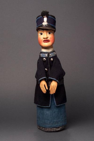 Cappello di lana blu, inchiodato alla testa in tre punti, rinforzato internamente con cartoncino, bordato alla base e alla sommità con striscie di finta pelle nera, dotato di visiera in pelle nera e decorato con fregio metallico sormontato da pompon di lana nera, due borchiette metalliche lucenti (ai lati della testa) e cordoncino di lana celeste, un po' consunto. Testa. di legno dipinta ad olio: incarnato chiaro, guance rosa, capelli, sopracciglia e ciglia grigi, labbra rosse. Occhi di vetro ricavati da spilloni. Leggere scrostature di colore su guance, bocca e mento; macchioline nere sparse sul viso. Colletto bianco, rigido, inchiodato. (continua in OSS)