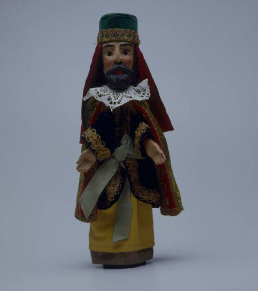 Cappello di velluto verde, inchiodato alla testa, rinforzato internamente con cartoncino, decorato alla base con passamaneria dorata. Dal cappello scende, fino all'altezza della cintura, una specie di kafiah di rasatello di cotone rosso bordeaux, un po' liso all'altezza dei capelli. Testa di legno con capelli, barba e baffi scolpiti. Dipintura ad olio: incarnato chiaro, guance rosa, capelli, sopracciglia, ciglia, barba e baffi marrone scuro, labbra rosse. Occhi di vetro ricavati da spilloni. Scrostature di colore sparse su tutto il viso e la barba. Qualche macchia marrone sul lato destro del viso. Gorgiera di pizzo bianca, fissata con uno spillo. (continua in OSS)