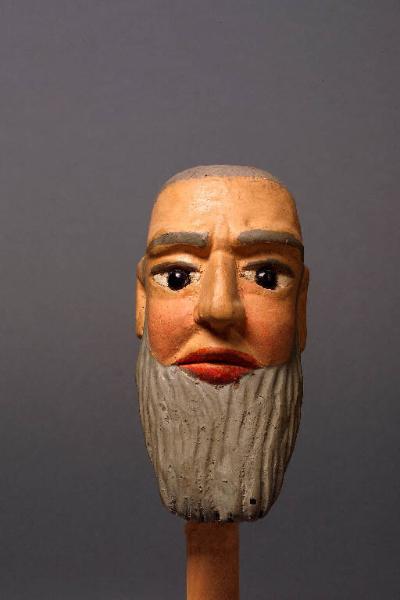 Testa di legno di dimensioni inferiori rispetto alla media dei burattini in schedario, con barba finemente scolpita. Dipintura ad olio: incarnato chiaro, guance leggermente più rosa, capelli, sopracciglia, ciglia e barba grigi, labbra rosse. Occhi di vetro ricavati da spilloni. Colletto di cartone bianco, inchiodato alla base.